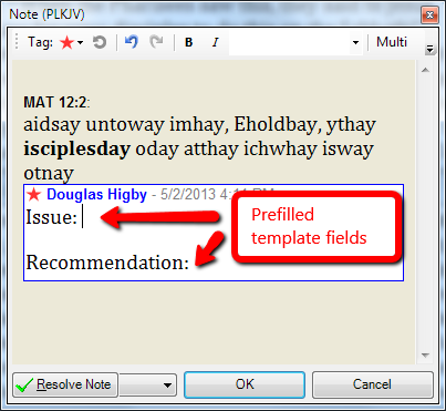 If you have standard text that you want to include in every note as a template for your remarks, add the text in the template column. It can contain multiple lines as in this example: