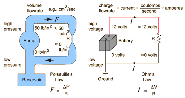 So consider this diagram on the right and please ignore all the fancy notes. If the pump (voltage) is twice and strong, then we could reasonably expect the current flow to be twice as fast. We would say the pump or the battery is more "powerful" and we would be correct. It would have twice the power or the ability to do work (see above) because we increased the "push" or the voltage by twice the amount as before. So by raising the voltage, we have raised the power of the system.