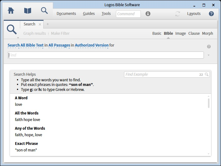 . This opens the Search Panel. Next select “Bible” as the search type, as shown below: